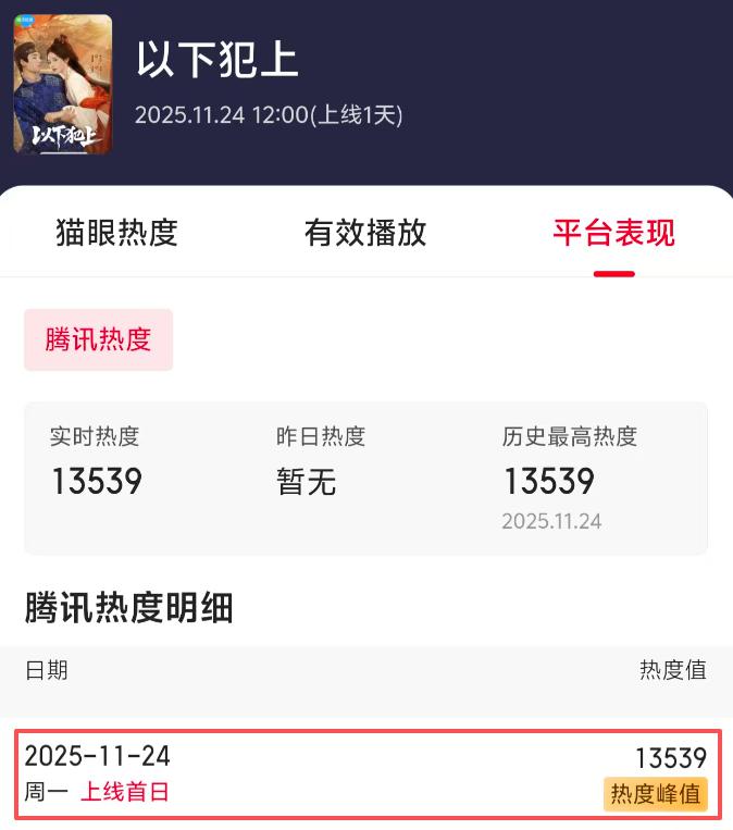《以下犯上》首播,热度飙升,峰值突破 13000。